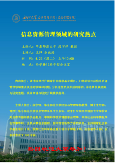 之后段宇锋教授面向公共信息资源管理系教师团队、学术研究生以及部分本科生进行了题为《信息资源管理领域的研究热点》的专题讲座。段教授通过梳理过往国家社会科学基金项目,归纳总结目前信息资源管理领域重点关注的领域和问题,分析这些热点形成的原因,评述其发展趋势,为研究选题、项目申请与研究开展提供指导。报告结束后,师生就论文选题与写作、研究工具和方法等与段老师进行了深入交流。最后,段教授也就华东师范大学经济与管理学部的教学研究情况做了介绍。