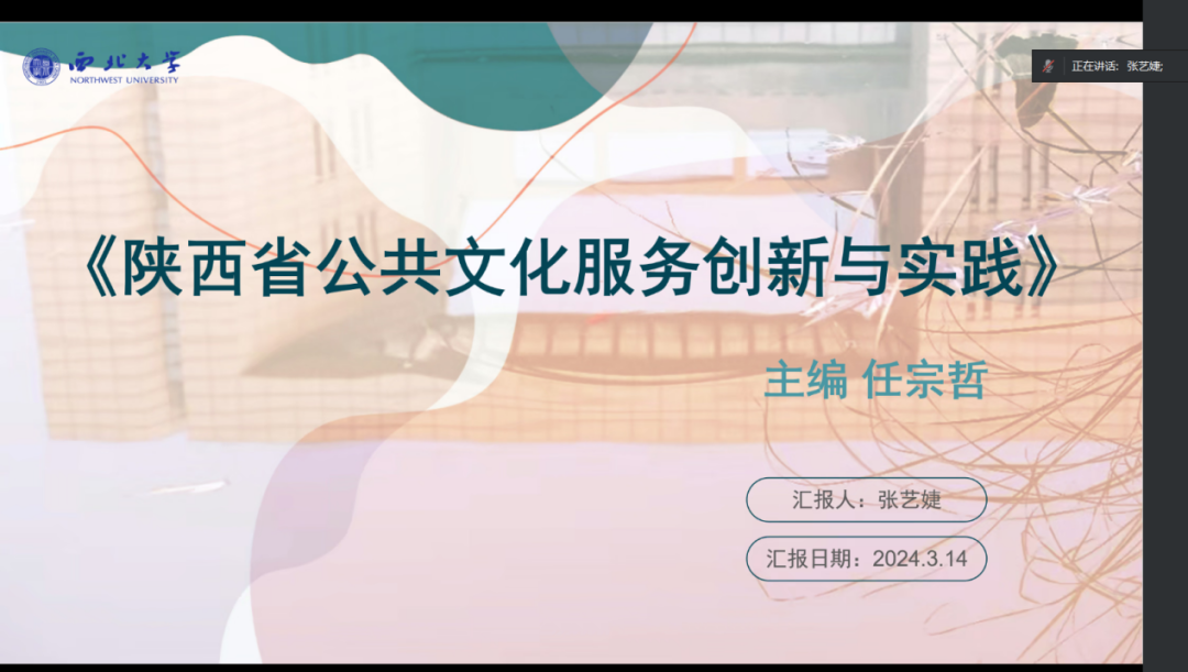 2021级图书馆学专业硕士研究生张艺婕分享的书目是任宗哲、段小虎等人编撰出版的案例集《陕西省公共文化服务创新与实践》,她从编委会专家简介、章节内容、案例分享、学习感悟这四个方面进行了分享。首先,她介绍到,十八大以来陕西省把“加强公共文化服务体系建设”摆在突出位置,并出台相关政策文件、建立专家库的背景,本书是对陕西省“十三五”时期公共文化服务创新案例的整理与汇编。其次,她对该书章节目录进行了简单介绍,并对“社会力量参与创新”以及“阅读推广服务创新”两章内容进行了系统性介绍。最后,通过“贫困地区图书馆总分制建设的千阳实践”、“以流动服务推动全民阅读的澄城实践”等陕西省先进案例向大家呈现了国家公共文化服务体系示范区(项目)所发挥的积极引领作用。