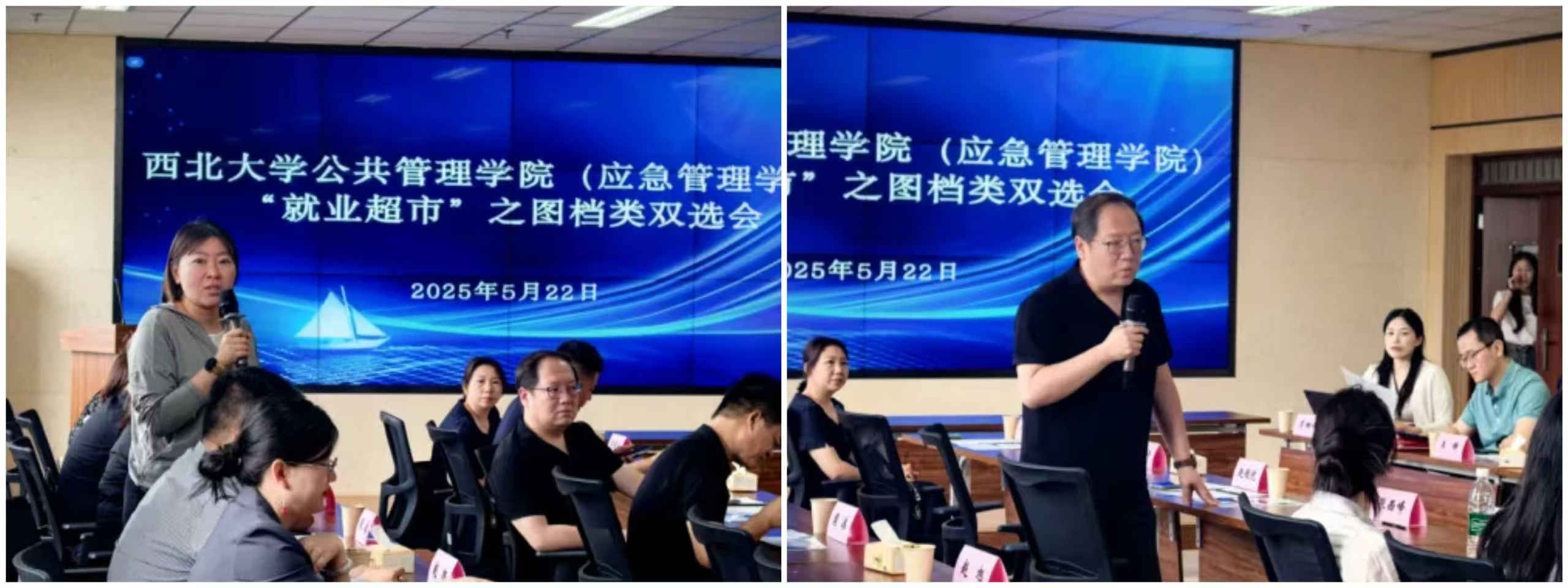 2025年5月22日,565net必赢客户端在长安校区西学楼13层学院会议室举办档案校企见面会暨就业双选会。西安中联经济发展有限公司、西安鑫创科技有限公司、西安曲江新区人才交流中心、陕西银雁科技服务有限公司、西安国翔数据信息有限公司、陕西兰台科技有限公司6家企业代表与学院师生齐聚一堂,围绕“档案专业人才培养交流与合作”主题,共商人才培养新方向,共探就业发展新路径。学院党委副书记韩杰、信息资源管理系主任王铮、黄新荣教授等出席会议,信息资源管理系支部书记李姗姗主持会议。