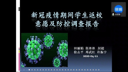 田丽娟讲师分享了“新冠疫情期间学生返校医院及防控的调查报告”。她从调查起因与背景、问卷填写者基本信息、数据分析报告、思考与建议四个方面展开了讲解。对不同学生群体返校意愿及线上、线下教学效果等问题进行了研究,提出了“提高在线教学质量,打造辅之以课堂教学的线上平台”、“对线上教学的不足实施有针对性的改进政策”、“实施医院、学校、学生的联防,谨慎考量并对疫情阶段返校的病毒防控”等对策。