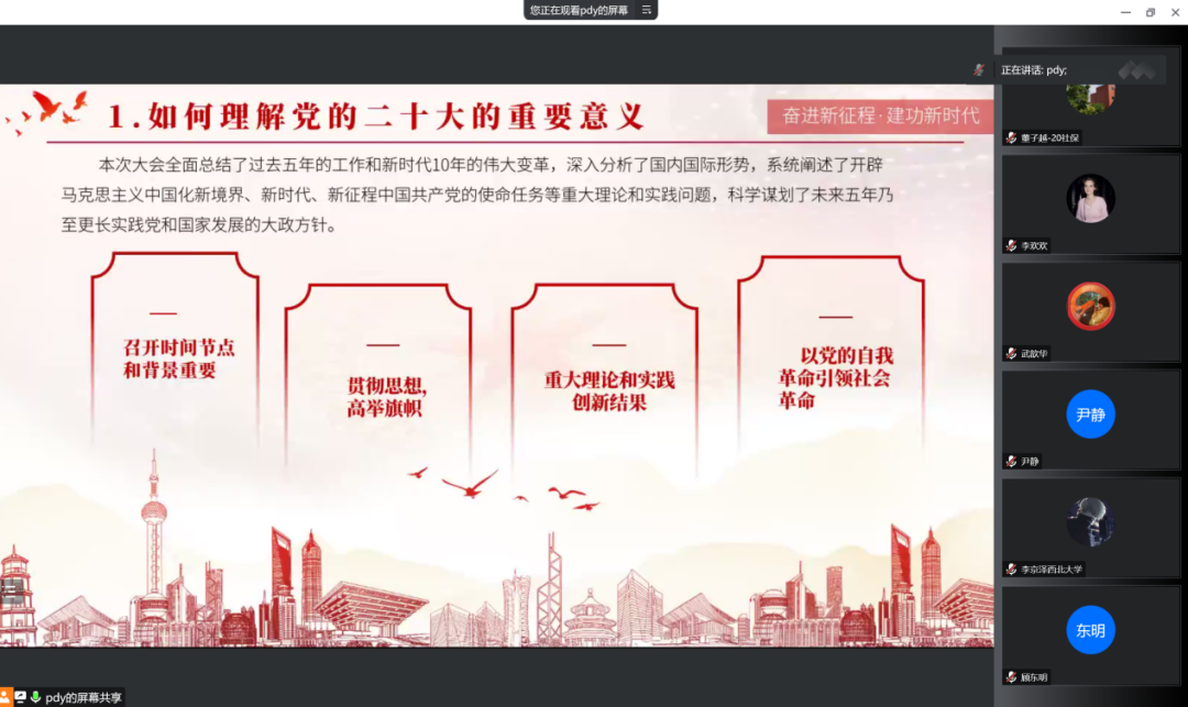 首先,彭丹阳同志带领支部成员从如何理解党的二十大重要意义,如何理解党的二十大主题,如何持续推进实践基础上的理论创新,为什么要扎实推进共同富裕,怎样理解健全覆盖全民、统筹城乡、公平统一、安全规范、可持续的社会保障体系,如何理解加快数字经济、促进数字经济和实体经济融合等六个方面结合社会保障专业解读党的二十大报告,深刻领会党的二十大精神。