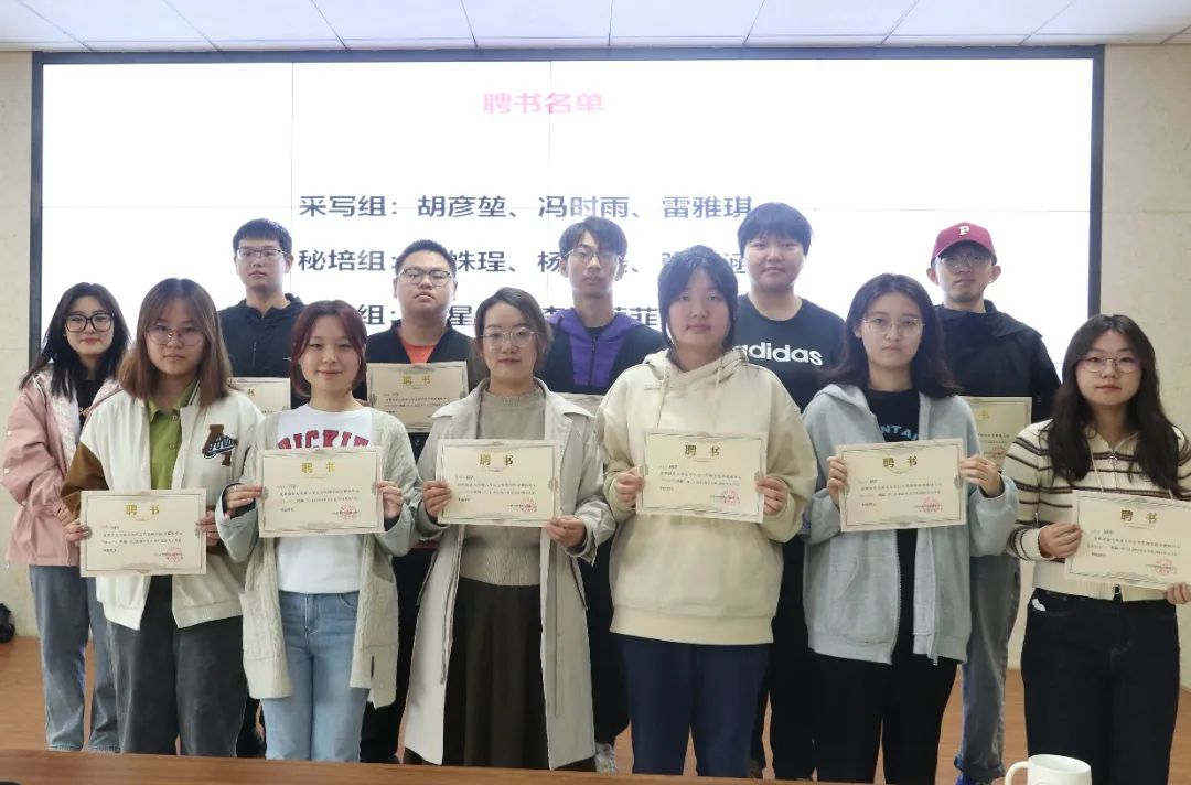 杨琬钰老师为主任团成员颁发聘书,全媒体中心主任陈婷婷为各组负责人颁发聘书,并一同合影留念。
